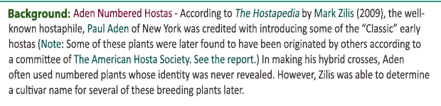 This is a non-conforming name for a hosta used by Paul Aden in his breeding program. Aden never revealed its genetic background or gave it a cultivar name. Some of his numbered cultivars have been identified and a list of these can be viewed by clicking the button below.