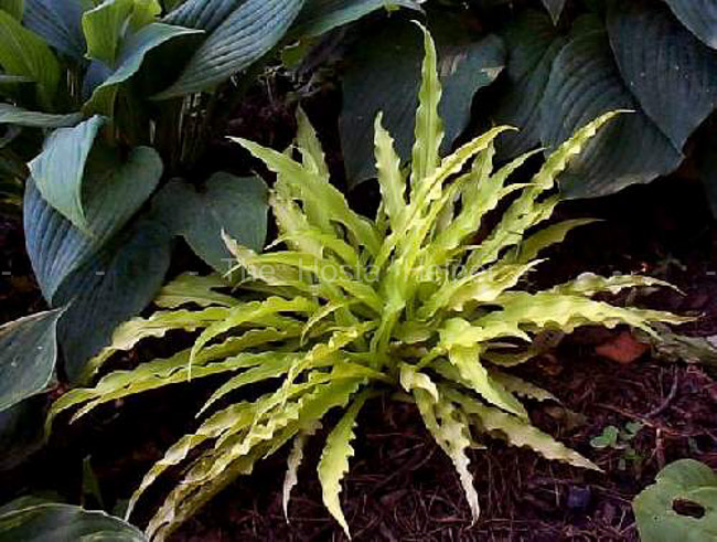 This non-registered cultivar from Ron Livingston of Michigan is a hybrid of H. 'Ginko Craig'× H. 'Chartreuse Wiggles'. It grows into a miniature size hosta only 5 inches in height by 16 inches wide with wavy, gold leaves.