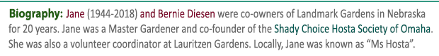 Jane and Bernie Diesen of Nebraska registered this fast growing sport of H. 'Guacamole' in 1998. Forms a large size (24 inches high by 50 inches wide) mound of convexly cupped, slightly corrugated foliage. It bears fragrant, pale lavender flowers from mid-August into September.