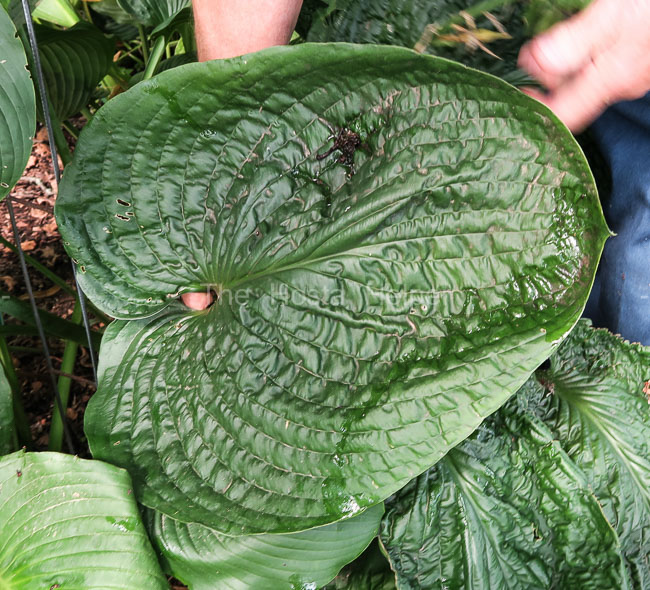 Bell shape flowers bloom from June into July. According to the registration materials: "...huge, dark, heavily corrugated leaf..."