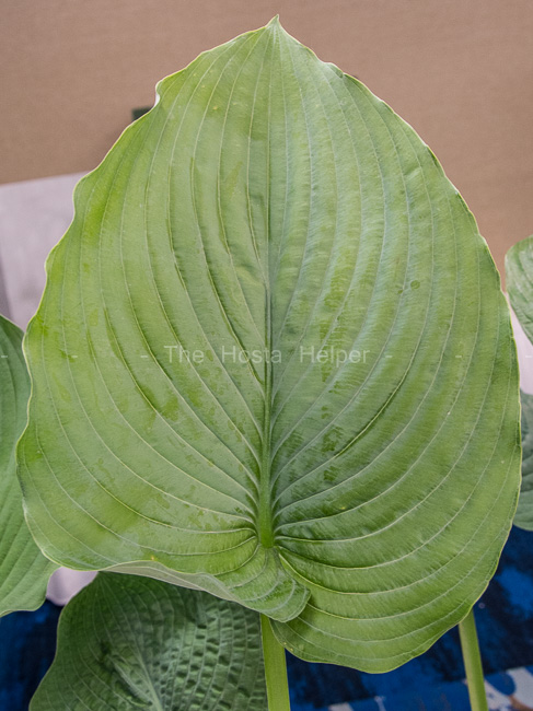 Dr. Leonard Jones of North Carolina registered this hybrid of H. 'Sagae' in 2002. It forms a large size plant with an upright form. The dark, blue-green foliage is slightly rippled and shiny on top. It bears near white flowers in July.