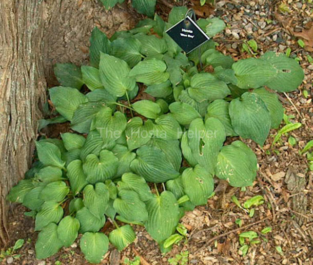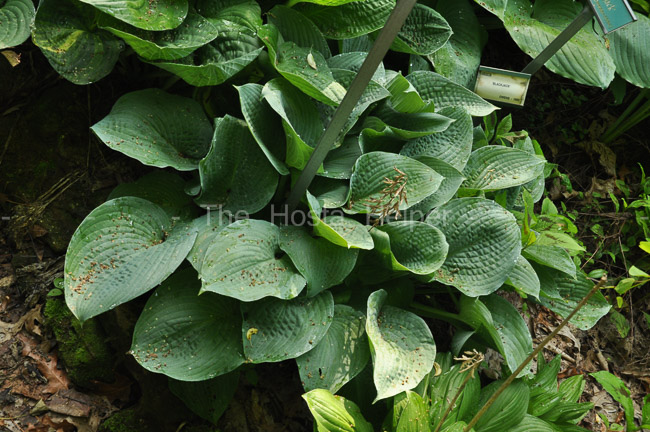 The Hostapedia by Mark Zilis (2009), "...shows traits of both parents." This plant forms a large size (19 inches high) mound of foliage with a cordate
