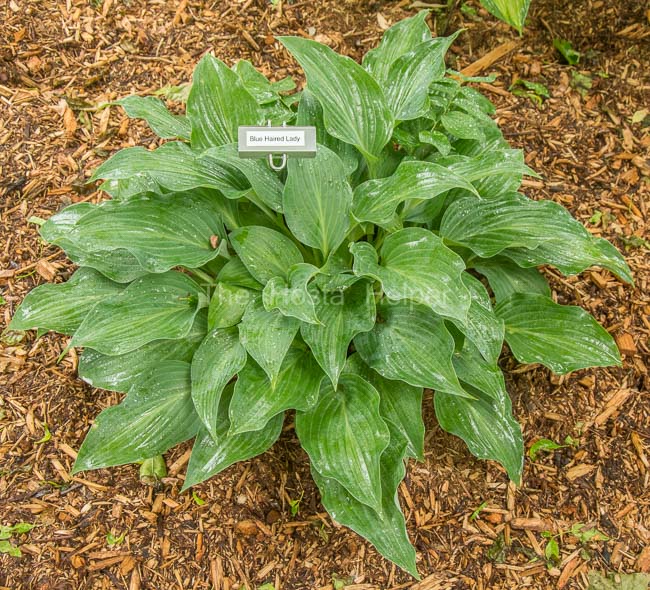 This seedling of H. 'Sum and Substance' × H. yingeri was registered by Greg Johnson in 2004. It grows to a medium size (17 inches high by 44 inches wide) with blue-green foliage. The leaves are slightly wavy and have bloom beneath. Pale lavender to white, spider-shaped flowers bloom in August.