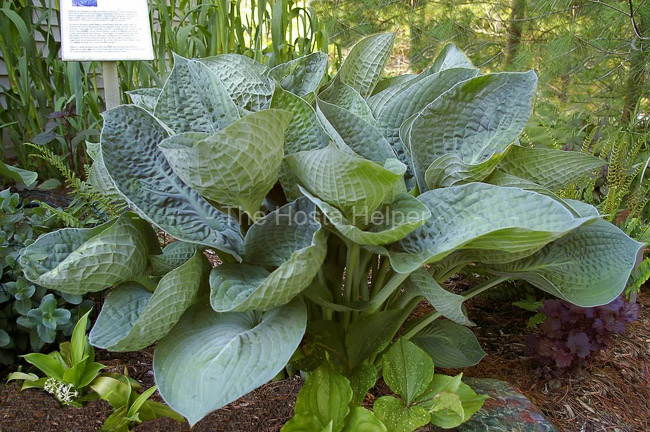 Frosty blue leaves are cupped and heavily corrugated. White flowers in early summer on this beautiful medium-large hosta.