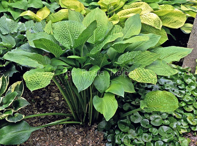 This plant of H. 'Sieboldiana'-type is a non-registered cultivar from Europe. It forms a medium to large size mound of foliage with a thick substance. The near-white flowers bloom from mid-June into July.