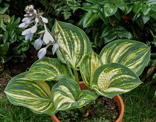 thick, broadly oblong-ovate evenly streaked leaves.