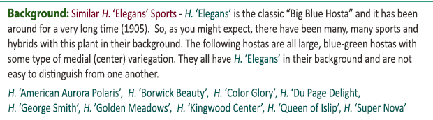 bullet Doesn't have leaves that exhibit the undesirable characteristic called "burning," "scalding," "browning," or "rusting" as does 'Color Glory' (a.k.a., 'Borwick Beauty'), which also is a sport with a bold bue-green border of H. 'Elegans'.