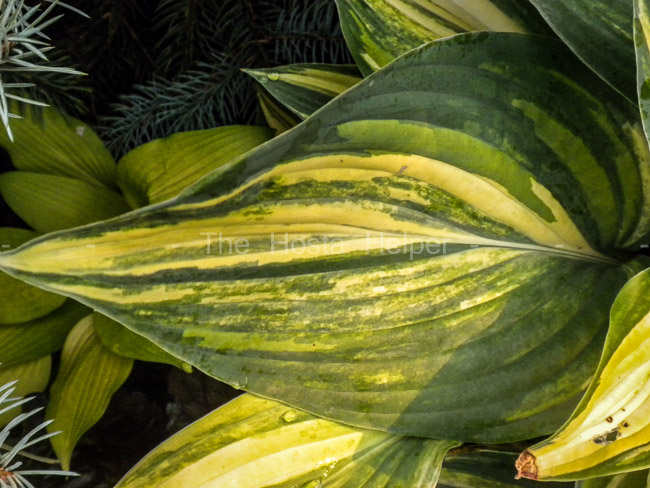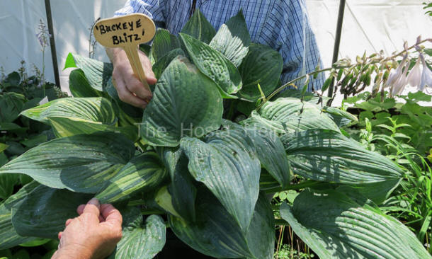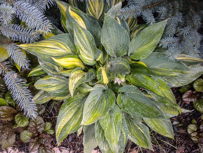 Flowers' × an unidentified hosta in 2012. It is a medium size plant
