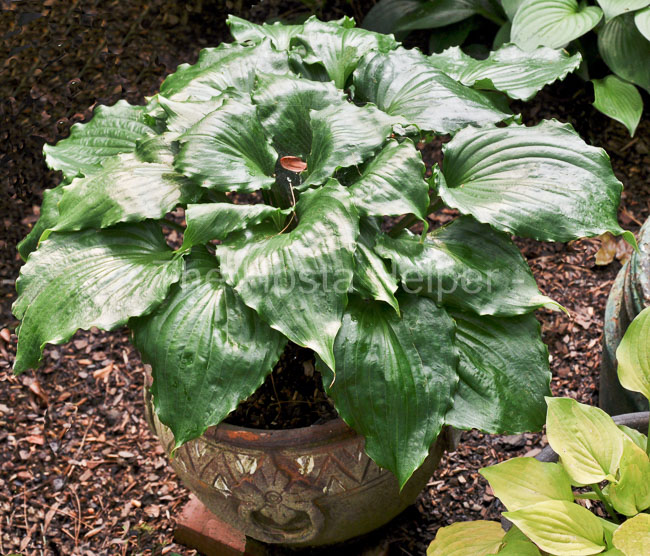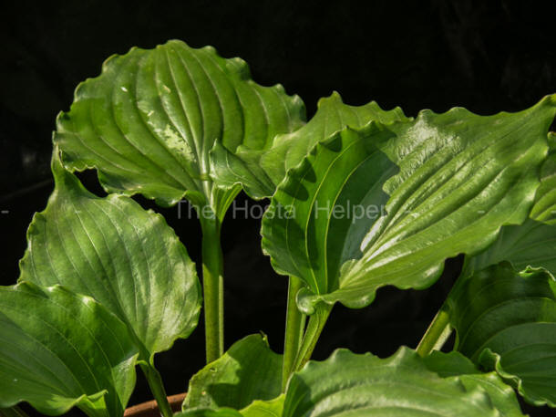 wide) hosta is heavily rippled, slightly wavy, very shiny on top