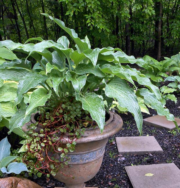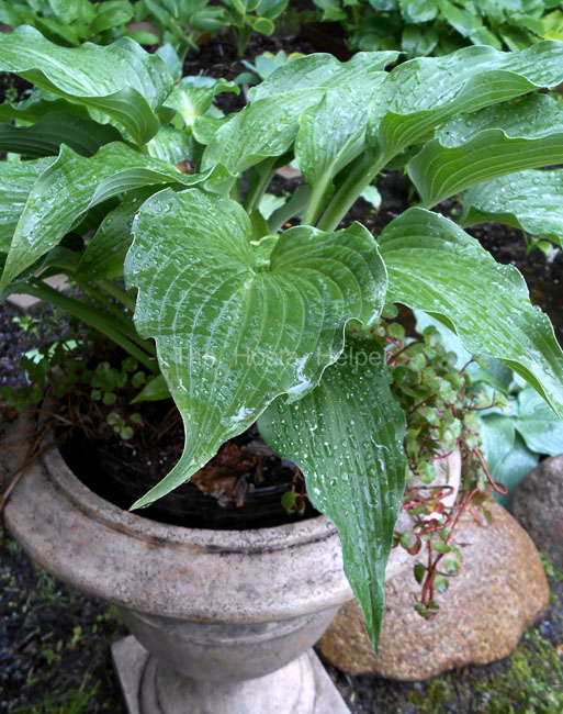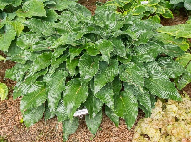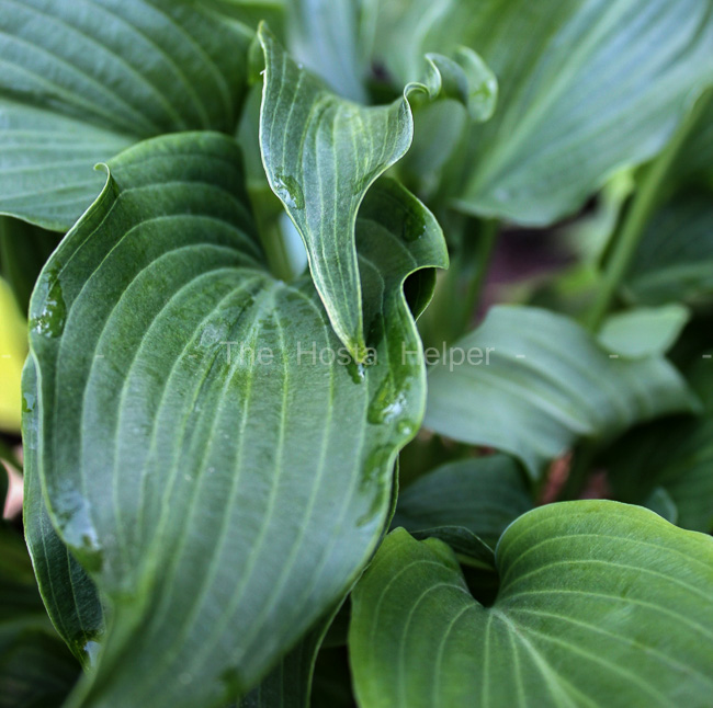 This hybrid of H. 'Elvis Lives' × H. 'Blue Cadet' is a non-registered cultivar from Ron Livingston of Michigan. It forms a small size mound with an upright form. The leaves are blue-green and very wavy.