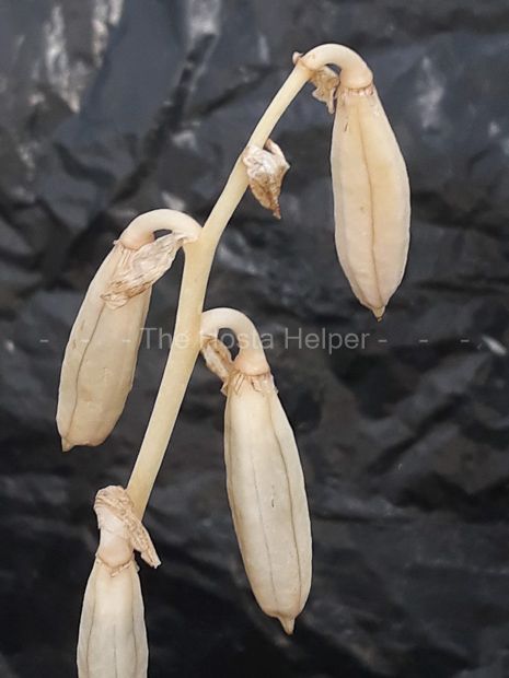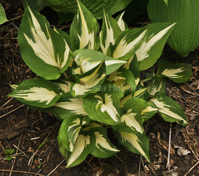 The New Encyclopedia of Hostas by Diana Grenfell (2009) states: "The base leaf color remains pristine ivory throughout the season. The flower heads die less than gracefully so remove them as they start to wither. Divide frequently...Smaller than its parent. A weak chartreuse overlay is apparent in the whitish variegation toward the petiole."