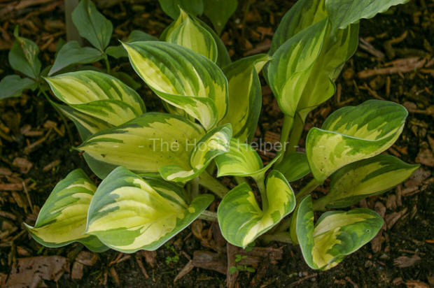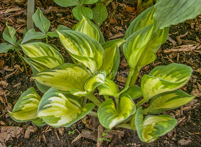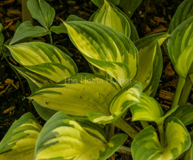 of Michigan, this small hybrid has leaves with a creamy yellowish-white center, dark green margin, and medium-green between the center and margin. Parentage: 'Pin Stripe Sister' X OP