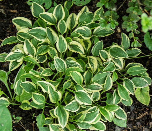 This hosta with H. venusta in its background is a non-registered cultivar from Japan. The miniature size hosta has green foliage with a creamy yellow to white marginal variegation.