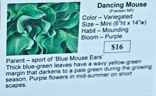 Pollock added: "Recently, Marco Fransen introduced 'Dancing Mouse'. Its blue-green leaves have a wavy yellowish-green border that darkens to pale green as the season progresses. He states that the ruffled margins and unusual color combination make it different from others in the series...(Is 'Dancing Mouse' a variegated 'Ruffled Mouse Ears'?)"