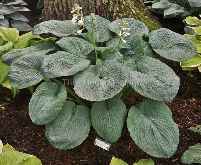 This seedling selection with H. 'Tokudama' or H. 'Sieboldiana' in its background was introduced by Mildred Seaver of Massachusetts and registered on her behalf by Kevin Walek (Hosta Registrar) in 2009. It forms a medium size (16 inches high by 20 inches wide) mound with broadly ovate leaves that are moderately corrugated and have thick substance.