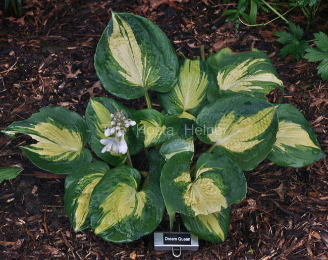 Originated by Jan van den Top of the Netherland and registered on his behalf by Registrar, Gayle Hartley Alley for The American Hosta Society in 2020, this cultivar is a sport of H. 'Great Expectations'. It is a medium to large size hosta which grows to about 19 inches in high by 34 inches wide. The foliage is moderate blue-green (116B RHS Colour Chart) with light yellow-green (145B RHS Colour Chart) medial (center) variegation. Its leaves vary from broadly ovate to nearly round in shape. They are slightly cupped, slightly corrugated, moderately wavy and glaucous on top. Near white flowers with very pale lavender stripes bloom in June followed by viable seeds. The pale yellowish-green scapes have variegated bracts and stand 20 to 24 inches tall.