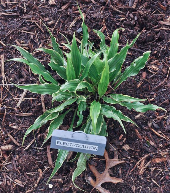 This hybrid of an unnamed seedling of [(H. 'Swoosh' × H. longissima) x H. 'Red Neck Heaven'] x H. 'Elvis Lives' was registered by Tony Avent of Plant Delights Nursery in North Carolina in 2005. It is a small size hosta about a foot high and has twisted, rippled foliage. It produces lavender flowers in July.