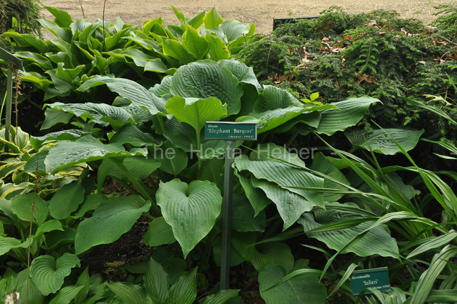 In an article about hybridizing by Tony Avent in The Hosta Journal (1996 Vol. 27 No. 1),  Tony gives the following comments on cultivars he has introduced: "H. 'Elephant Burger' - op (open-pollinated) seedling of unknown parent from a hosta that I found in an old garden...uniquely corrugated foliage...introduced as a breeder only...makes great offspring when used as a pollen parent to put leaf corrugation in fast growing smaller hostas."