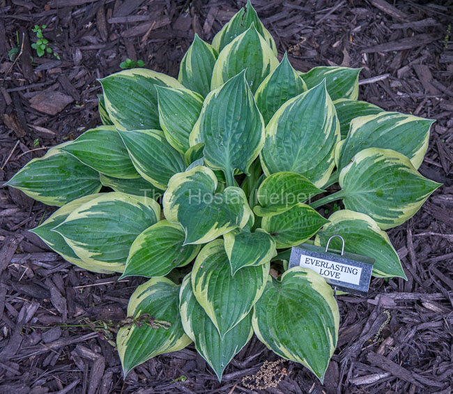 Greg Johnson of Iowa registered this hybrid of H. 'Neat Splash' × H. 'Dorset Blue' in 2004. The clump grows