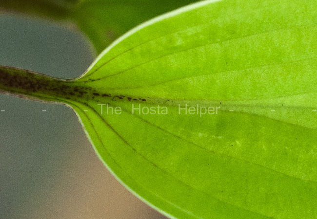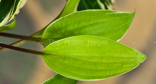 This sport of H. 'Designer Genes' was registered by Mark Zilis of Illinois in 2011. It grows into a medium size hosta about 14 inches tall and 30 inches wide with red petioles and flower scapes. The purple flowers open in mid-July.