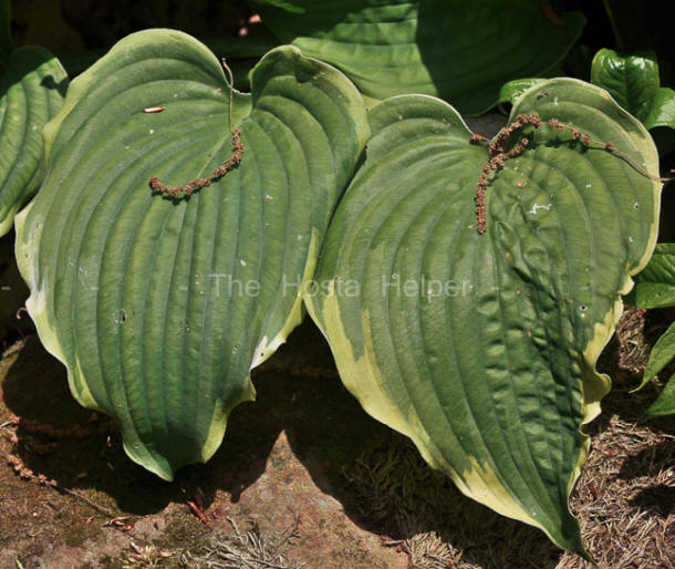This hybrid of H. 'Christmas Tree' × H. 'Donahue Piecrust' was originated