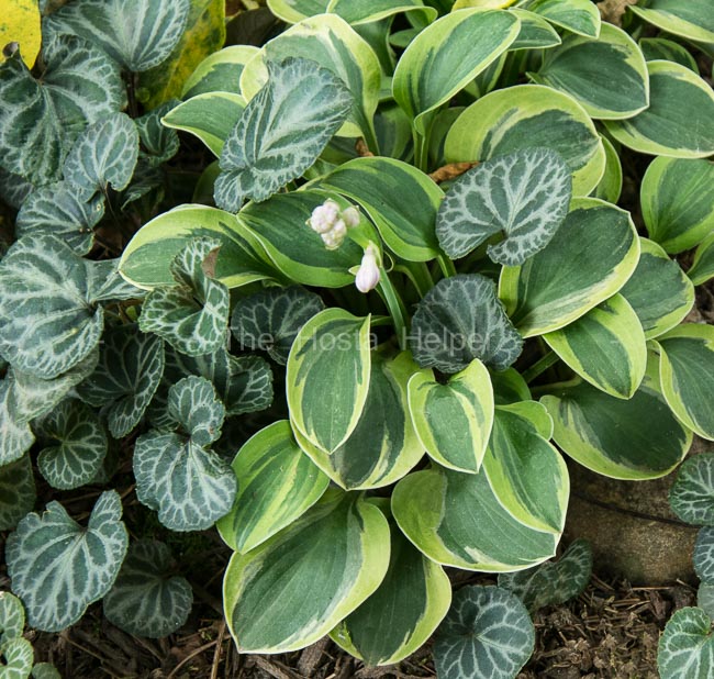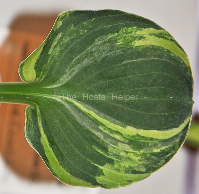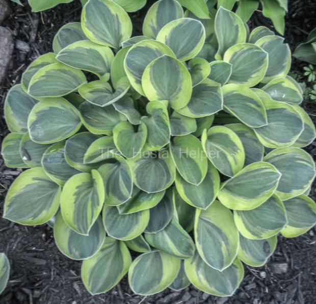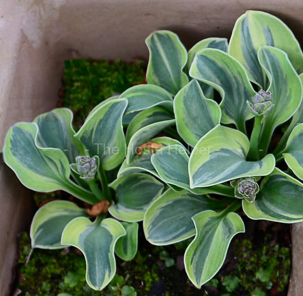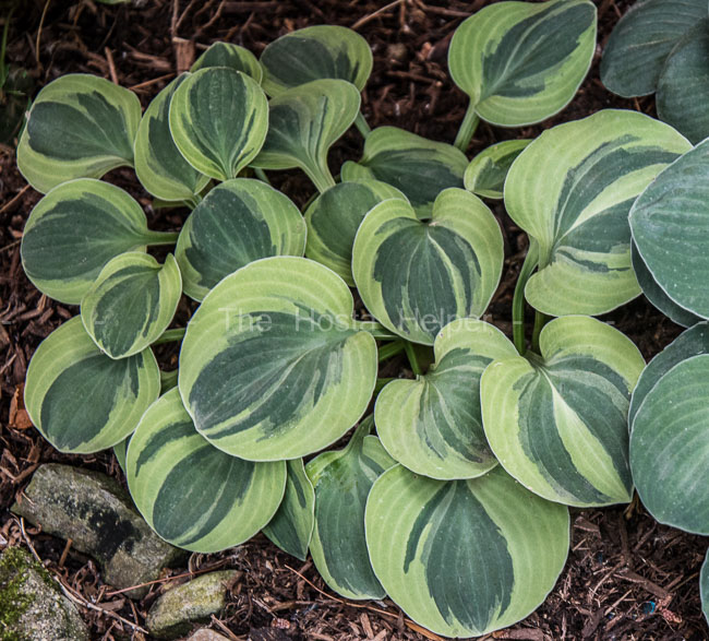 "H. 'Royal Mouse Ears' is described as having blue-green foliage with numerous gold and creamy-white streaks throughout the leaf blade. Jan van den Top reports it emerges with plain bluish-green leaves and streaking appears a month or so later. In addition to streaks in the center, also expect distinct creamy margins. Further, don't be surprised if 'Royal Mouse Ears' settles out as a margined-leaved 'Frosted Mouse Ears'. Recall: 'Frosted Mouse Ears' and 'Holy Mouse Ears' originally came from 'Royal Mouse Ears'."