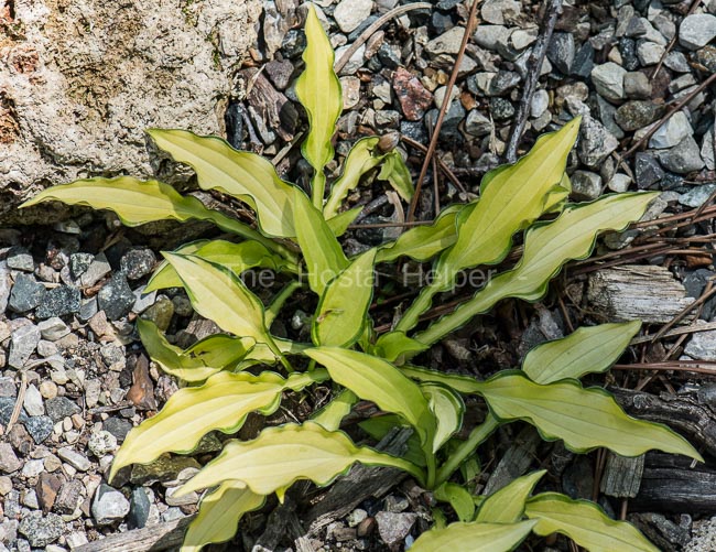 This non-registered cultivar from Japan has H. sieboldii in its background. It forms a small size clump of moderately wavy, gold foliage with green marginal variegation.
