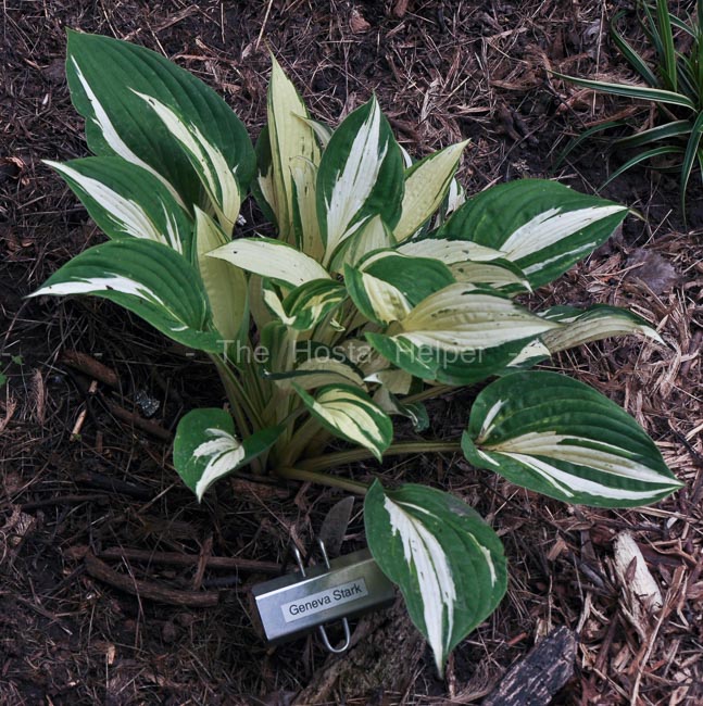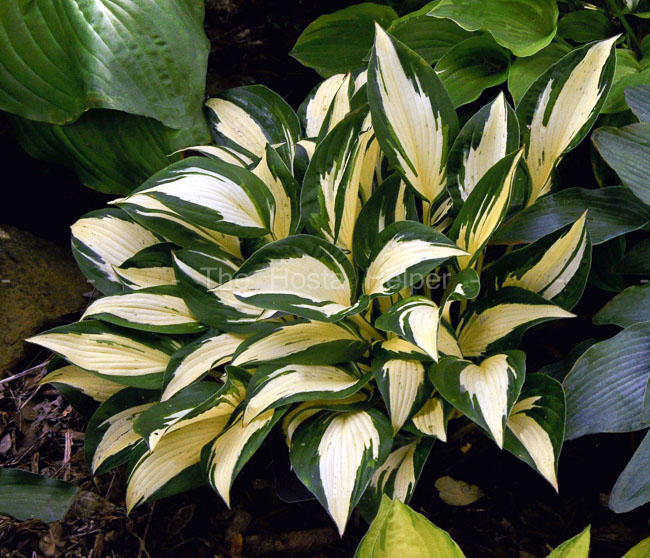 This sport of H. 'Mountain Green' was registered by Dr. Charles Purtymun and Jay Hyslop of Walden West Nursery of Oregon in 1999. The medium size mound of variegated foliage has pale purple flowers in July.