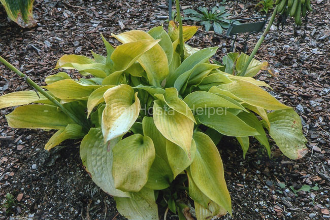 Registered by Dr. Dick and Jane Ward of Ohio in 2009, this small size (10 inches high by 20 inches high) cultivar is of unidentified parentage. The foliage is light green in color, slightly rippled, slightly wavy, broadly ovate and dull on top. Tubular flowers bloom from mid-July into August on scapes up to 28 inches tall.