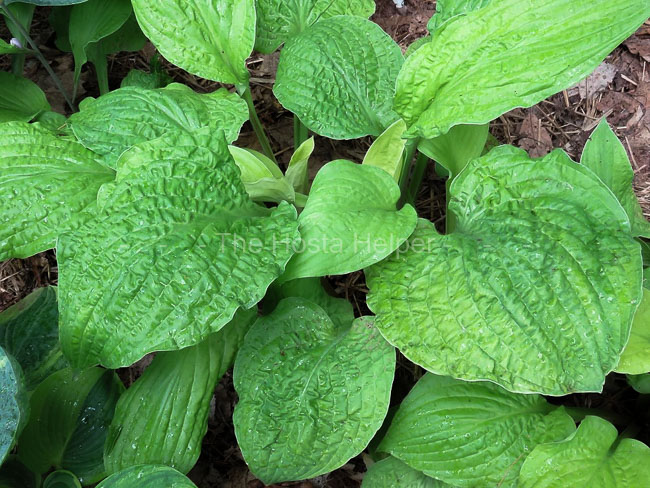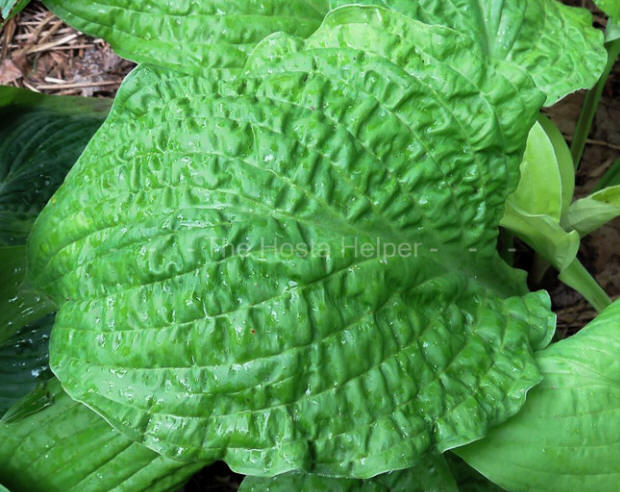 Intensely corrugated, leaves start out chartreuse in early spring and then turn green later in the season on this large hosta.