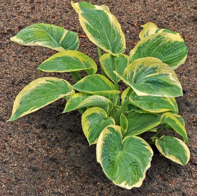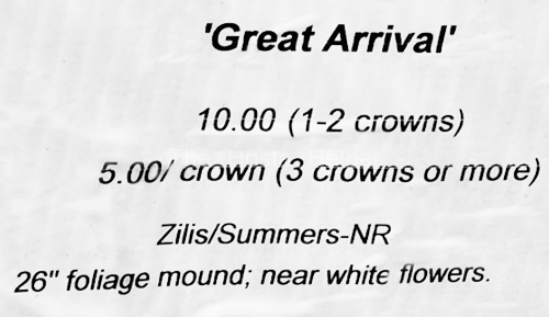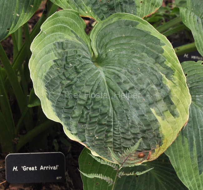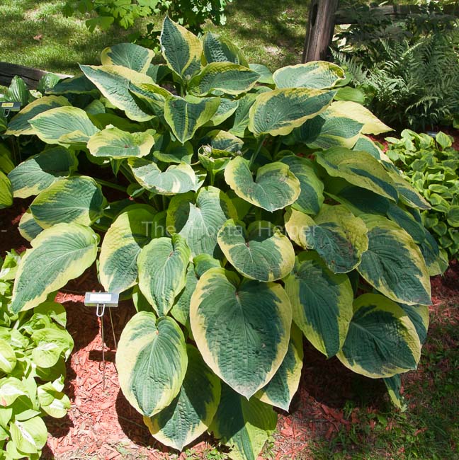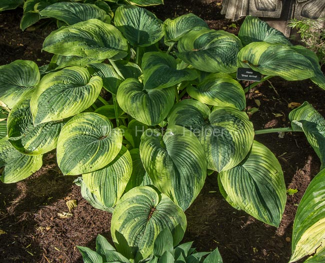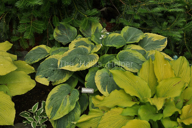This reversed sport of H. 'Great Expectations' originated in tissue culture at Q&Z Nursery of Illinois. Mark Zilis former owner of the nursery registered it in 2003. The large size mound grows to about 26 inches in height and a width of 50 inches with heavily corrugated leaves. Clusters of near white flowers bloom in late June.