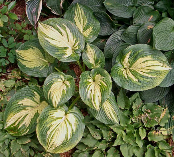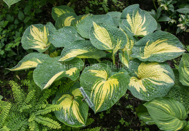 This classic hosta was introduced by John Bond of Savill Gardens in England and was registered by Paul Aden of New York on his behalf in 1988. It is a giant size (29 inches high by 58 inches wide) hosta which is a sport of H. 'Elegans'.