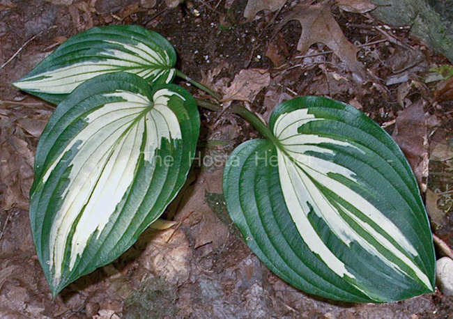 medium size (12 inches high) mound of white centered, dark green margined foliage. Pale