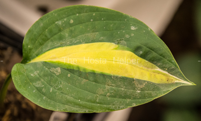 Danny Van Eechaute of Belgium registered this sport of H. 'Kiwi Full Monty' in 2011. It is a medium size plant growing to about 19 inches in height with a width of around 30 inches. The leaves are medium blue-green with a yellow medial (center) variegation. They are slightly rippled, slightly wavy, slightly corrugated and ovate. Pale lavender flowers bloom from June into July.
