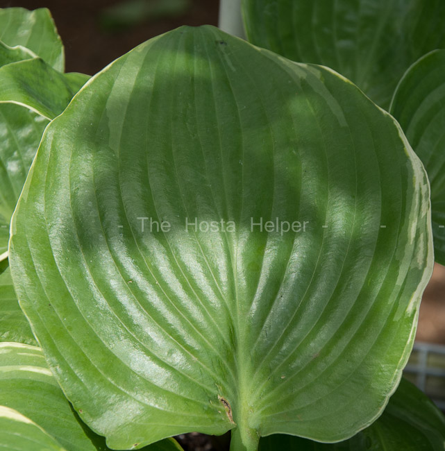 white marginal variegation. Its leaves are broadly ovate, slightly cupped, slightly folded, slightly wavy and slightly shiny
