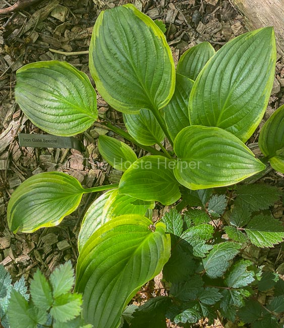 This cultivar which is a sport of H. 'Iron Gate Supreme' from Van Sellers and Vic Santa Lucia of North Carolina which was registered on their behalf by Kevin Walek (Hosta Registrar) in 2009. The plant grows to a medium size about 14 inches in height with a spread of 34 inches. Its green foliage has a yellow to creamy white marginal variegation. Pale lavender, fragrant flowers bloom in August.