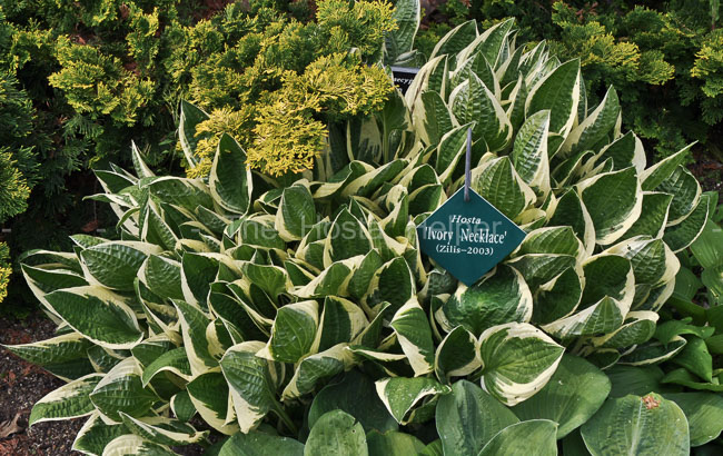 This tissue culture sport of H. 'Emerald Necklace' was registered by Mark Zilis of Illinois in 2003. It grows into a medium size hosta about 15 inches in height with a spread of around 40 inches. The medium purple flowers bloom in late July.