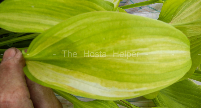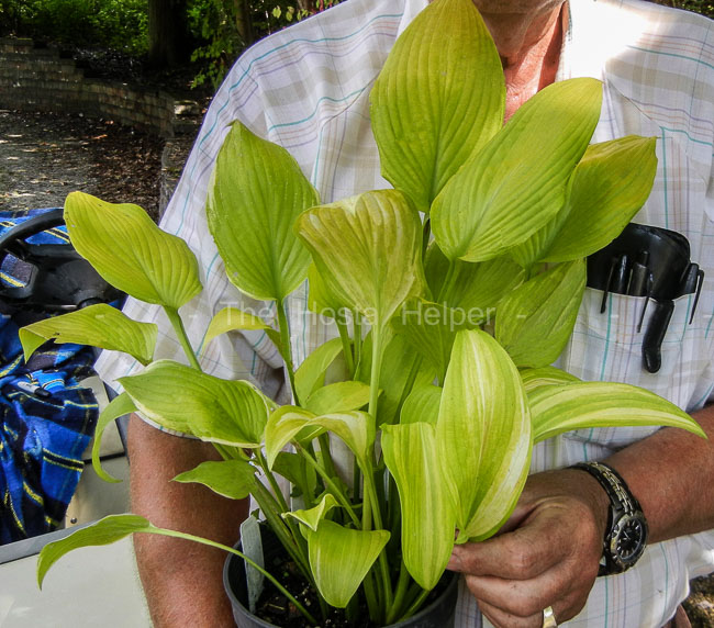 high by 20 inches wide) hybrid of H. 'Zany Janie' × an unidentified hosta in 2013. The leaves are a medium gold color with white