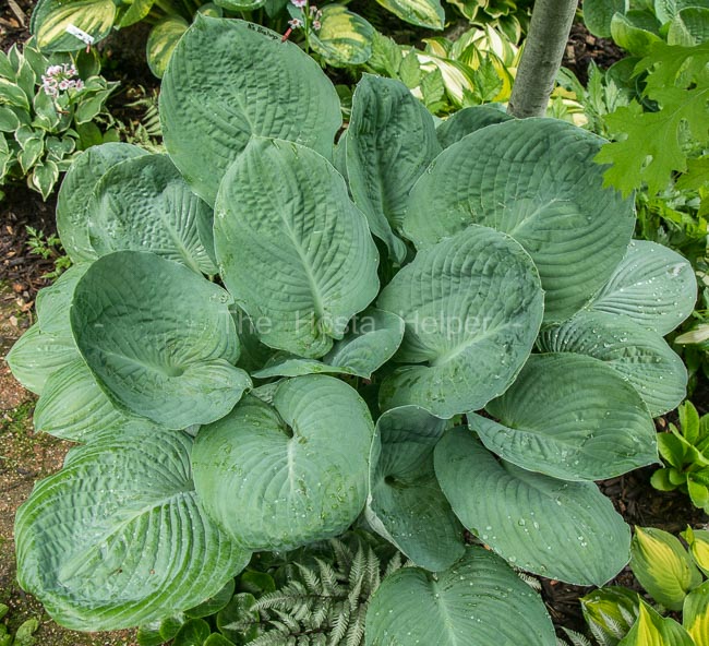 Originated by Herb and Gladys King of Wisconsin, this large size, non-registered cultivar is of unidentified parentage. The blue-green foliage is slightly corrugated, slightly cupped and wavy.