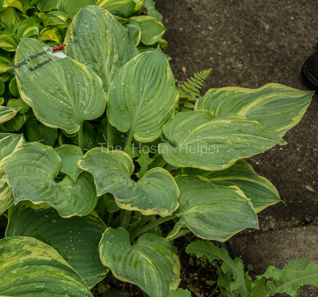Originated by Herb and Gladys King of Wisconsin, this upright growing, non-registered cultivar is of unidentified parentage. It has blue-green foliage with irregular yellow marginal variegation with yellow streaks in parts of the wavy leaves.