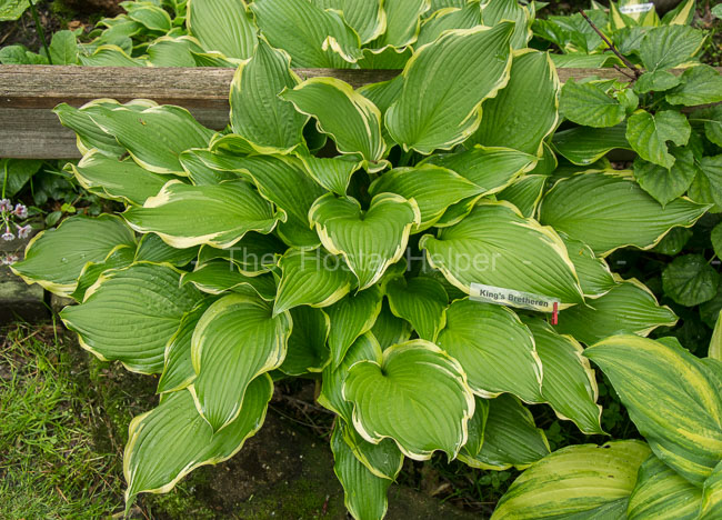 Originated by Herb and Gladys King of Wisconsin, this large size, non-registered cultivar is of unidentified parentage. It has pointed, wavy green leaves with pale yellow marginal variegation.