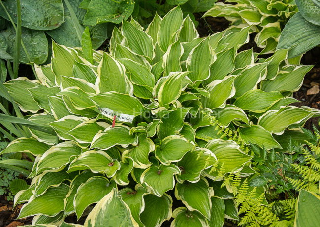 Originated by Herb and Gladys King of Wisconsin, this medium size, non-registered cultivar is of unidentified parentage. It is green with a cream yellow to white colored marginal variegation. The leaves are slightly wavy and come to a point.