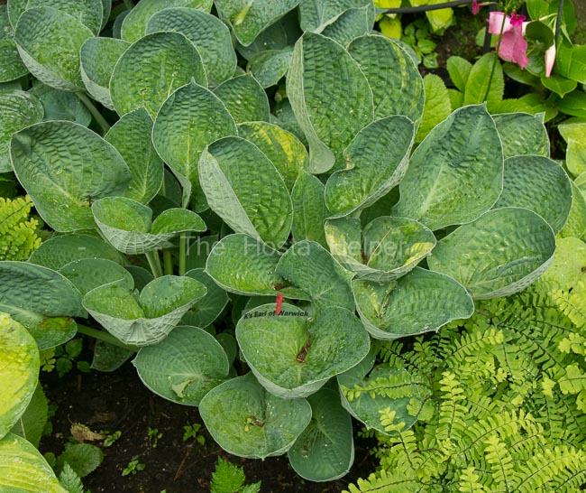 Originated by Herb and Gladys King of Wisconsin, this medium size, non-registered cultivar is of unidentified parentage. The blue-green foliage has some light yellow coloration on a few leaves. They are heavily cupped and heavily corrugated.