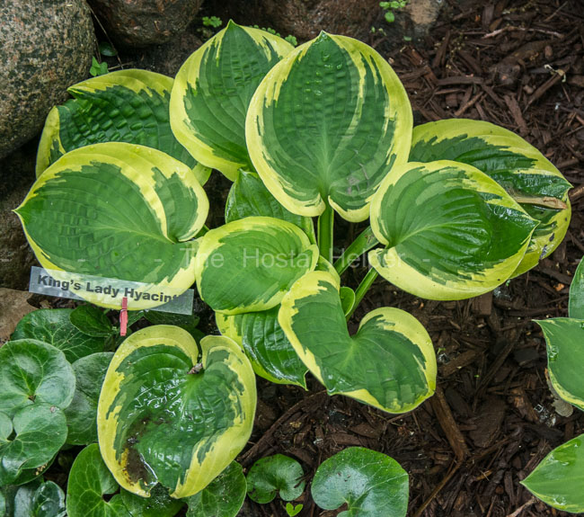 Originated by Herb and Gladys King of Wisconsin, this medium size, non-registered cultivar is of unidentified parentage. The green foliage has a creamy yellow marginal variegation.