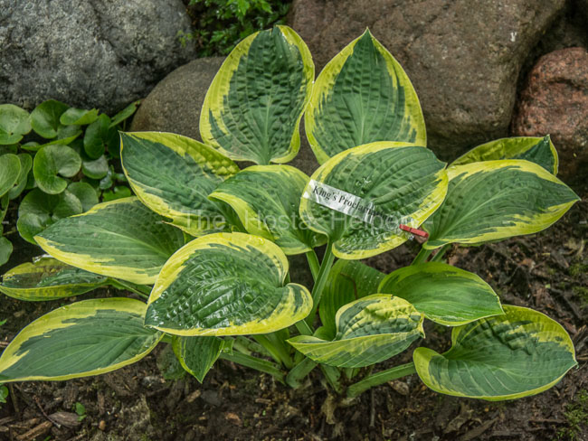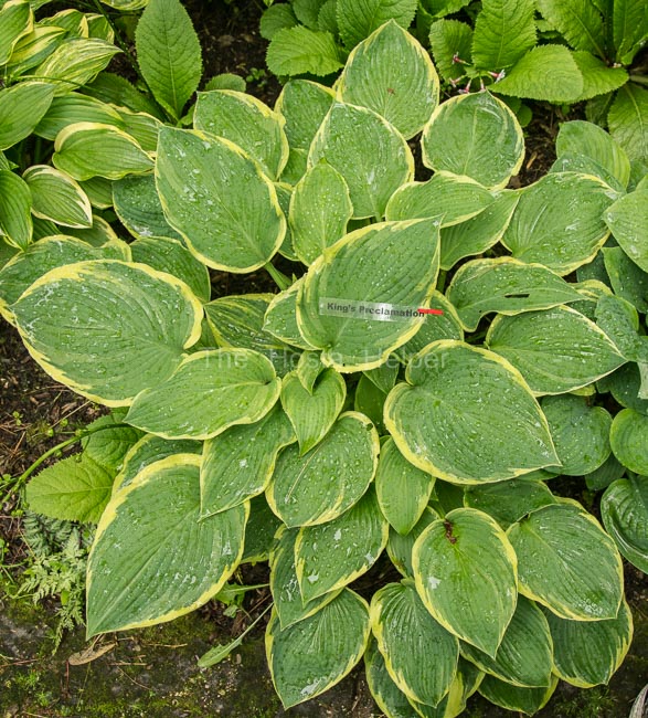 Originated by Herb and Gladys King of Wisconsin, this non-registered cultivar is of unidentified parentage. This medium to large size hosta is green with a narrow, creamy yellow marginal variegation.
