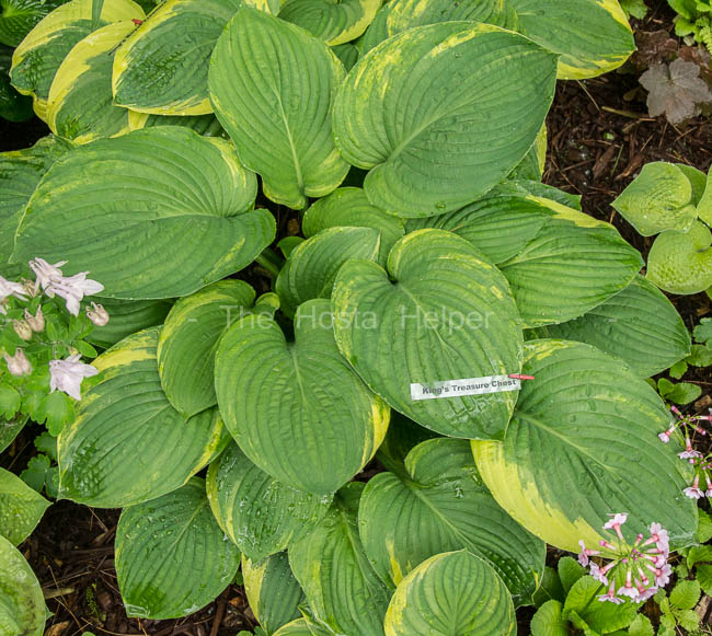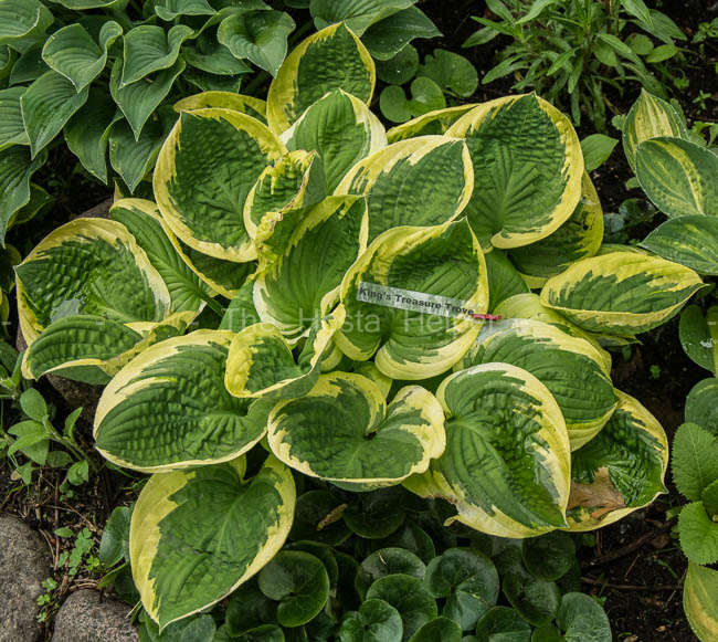 Originated by Herb and Gladys King of Wisconsin, this small size, non-registered cultivar is of unidentified parentage. It is a dark green hosta with creamy yellow marginal variegation. The leves are slightly cupped and slightly corrugated.