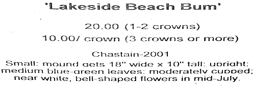 This sport of H. 'Lakeside Shore Master' was registered in 2003 by Mary Chastain of Lakeside Acres Nursery in Tennessee. Measuring 15 inches high and 38 inches wide, this medium size cultivar bears near white flowers in late June.