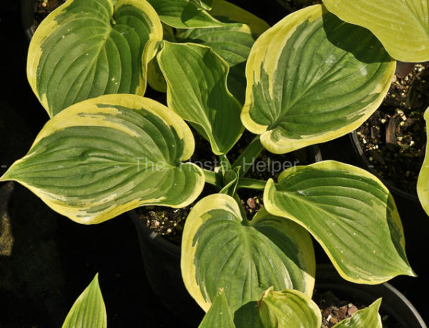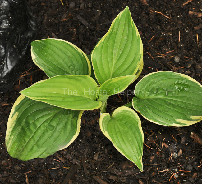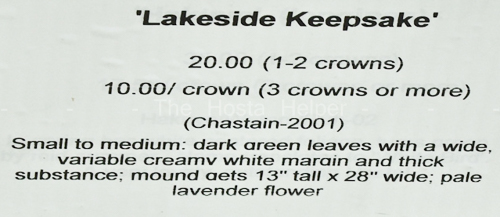 This seedling of H. 'Lakeside Roy El' was registered in 2001 by Mary Chastain of Lakeside Acres Nursery in Tennessee. It grows into a medium size hosta about 13 inches in height and spreads to 28 inches in width. The leaves are very broadly ovate, moderately corrugated with thick substance. Pale lavender flowers bloom in early summer.