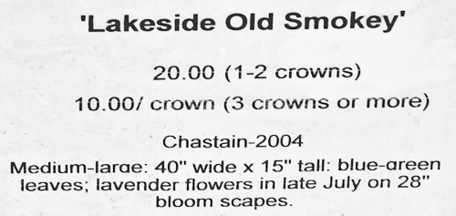 This cultivar is a hybrid of two unnamed seedlings which grows to about 15 inches high and spreads to 40 inches wide. It was registered in 2004 by Mary Chastain of Lakeside Acres Nursery in Tennessee. Lavender flowers bloom starting in late July.