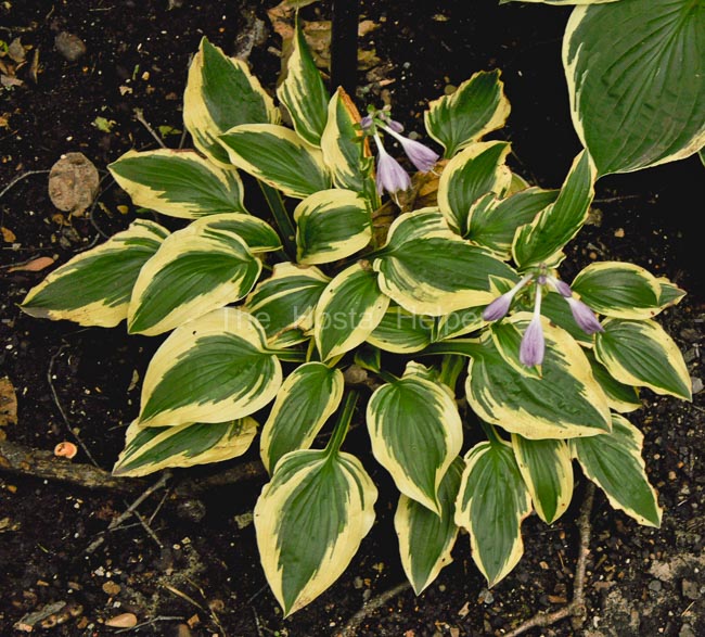 reversed form of H. 'Sitting Pretty'. It forms a small size mound and bears bright purple
